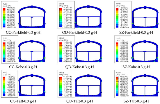 In order to compare the seismic responses of the fabricated subway stations with different joint distributions, the mechanical and deformation characteristics, such as plastic strain, interlayer relative deformation, and internal force, under different ground motion records (Parkfield wave, Kobe wave, and Taft wave), different seismic intensities (0.1 g, 0.2 g, 0.3 g), and different earthquake conditions (H, HV) were studied. The model named CC-Parkfield-0.3 g-H represents the seismic response of Yuanjiadian station in Changchun under the horizontal component of Parkfield wave with the peak acceleration of 0.3 g. HV represents the coupling effect of horizontal and vertical components.