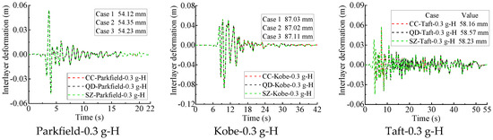 Figure 12 shows the time history of the relative deformation between the vault and the bottom plate of the fabricated station structure (interlayer relative deformation). Table 5 shows the maximum interlayer relative deformation of the fabricated station structures with the different joint distributions. Under the excitation of different ground motions, the maximum interlayer relative deformations of the CC model, QD model, and SZ model reached 87.03 mm, 87.03 mm, and 87.11 m, respectively. The maximum influence rate of the vault or bottom plate joints on the interlayer relative deformation was only 0.7%. The deformation of the structure depended on the constraint of the soil and mainly the characteristics of the seismic waves. Under the same ground motion, the interlayer relative deformation of the fabricated station structure was almost the same; therefore, the distribution form of the joints could be ignored.