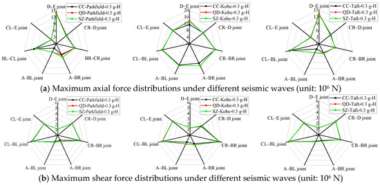 In addition to deformation and plastic strain, the internal force at the joints of the fabricated station structure is also an important index to study seismic performance. Figure 13 shows the maximum internal force distribution at the joint positions of the fabricated station structure.