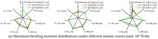 Table 9 shows the maximum plastic strain of the fabricated station structures under the coupling effect of horizontal and vertical components. The existence of vertical ground motion increased the seismic load of the overburden of the underground structure, and thus increased the axial force of B–C joint, resulting in the increase in the plastic strain of the B–C joint. The maximum plastic strains of the CC model, QD model, and SZ model reached 0.0217, 0.0219, and 0.0213, respectively, under the coupled seismic action. Compared with the horizontal seismic action, the plastic strain of the BR–CR joints on the sidewall increases obviously. The maximum impact rate of the vault or bottom plate joints on the structural failure was 3.05%.