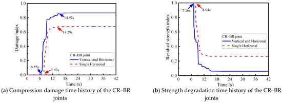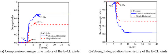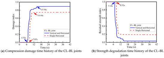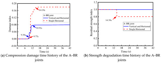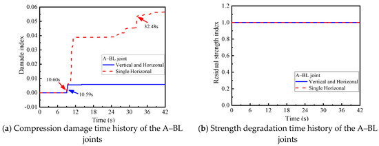 Figure 15 and Figure 16 show the A–B joint’s damage and residual strength histories under different seismic conditions.