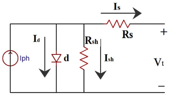 A modified Shockley diode equation can describe a single diode model. It is widely used for modeling solar cells because it is simple to implement with five parameters (). However, at low illuminations, the single diode model is particularly inaccurate in describing cell behavior [,]. Figure 1 shows a single diode model consisting of a current source in parallel with a diode, and the module shunt resistance controls the loss of currents at the junction within the cell.