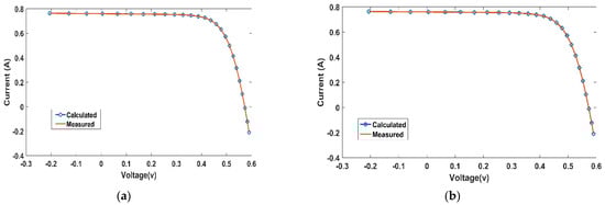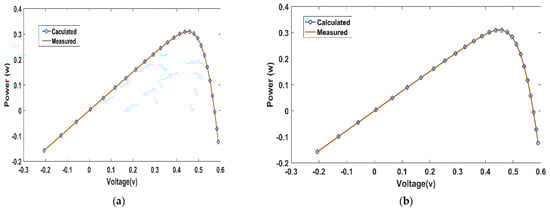 Figure 8 and Figure 9 show the power and current of the calculated and measured current from cultural-based EHO. Again, the measured and calculated curves are almost identical, while the relative error for the double-diode model for cultural-based EHO is presented in Table 6.