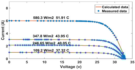 The previous results were for the PV panels at standard temperature and radiation. The four EHO algorithms were tested against three other algorithms at different irradiance levels and temperatures for more testing. Table 7 shows the extracted parameters for the seven algorithms at different irradiance levels and temperatures. Finally, the three-diode model is tested against three algorithms from [] (Moth-Flame Optimizer (MFO), FPA, and Hybrid Evolutionary algorithm (DEIM)). The RMSEs for each algorithm at varying irradiance levels are listed in Table 8. Again, at low radiation with 109.2 W/m2, CEHO outperforms EHO with a slightly small difference but a big difference compared to other algorithms. CEHO outperformed other algorithms at other radiations, and BIEHO’s results were slightly different from CEHO’s. The superiority of the CEHO algorithm is proven as the best compared with the other three variants and the other three algorithms for all irradiance levels. Figure 10 shows that calculated data fit the I-V curve of measured data for CEHO.