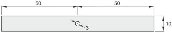The material used in this study was a carbon-fibre-reinforced epoxy composite, which was prepared via autoclave/vacuum-bag moulding using a unidirectional high-strength carbon prepreg (Texipreg HS 160 REM). The plates were produced with 12 layers, arranged in a stacking sequence of (0/45/90/–45/0/90)s, corresponding to a thickness of 1.8 mm and Vf = 40%. More details about the manufacturing process can be found in [34]. As shown in Figure 1, the specimens were obtained from these plates and consisted of a rectangular cross-section geometry with a 3 mm-diameter central hole. The hole was drilled via twist drill bits for composite materials.