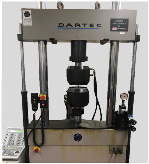 Fatigue tests were carried out in a 100 kN servo-hydraulic tension–compression machine, under uniaxial constant-amplitude loading, using sinusoidal waves, with a stress ratio (R) equal to 0.1 and a frequency of 10 Hz (see Figure 2). The applied normal stress amplitudes (calculated based on the net cross-section, i.e., dividing the applied force by the net cross-section area) and the corresponding fatigue lives for the tested specimens are summarised in Table 2. The stiffness modulus variations were evaluated directly from the vertical displacement of the crosshead relative to the zero-load displacement. Finally, after the fatigue tests, fracture surfaces were examined by optical microscopy, LEICA MC120 HD DM4000 M LED, to identify the dominant damage mechanisms.