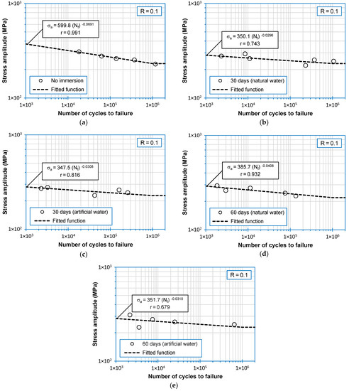 S–N curve for the series: (a) without seawater immersion, (b) 30-day immersion in natural seawater, (c) 30-day immersion in artificial seawater, (d) 60-day immersion in natural seawater, and (e) 60-day immersion in artificial seawater.