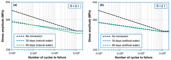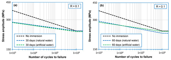 From all these curves, it is possible to evaluate the effect of exposure time and the type of seawater (natural and artificial seawater) on the fatigue life, comparing the mean curves obtained by the linear relationship of the results obtained. Therefore, this comparison is shown in Figure 4 in terms of exposure time and in Figure 5 in terms of seawater type.