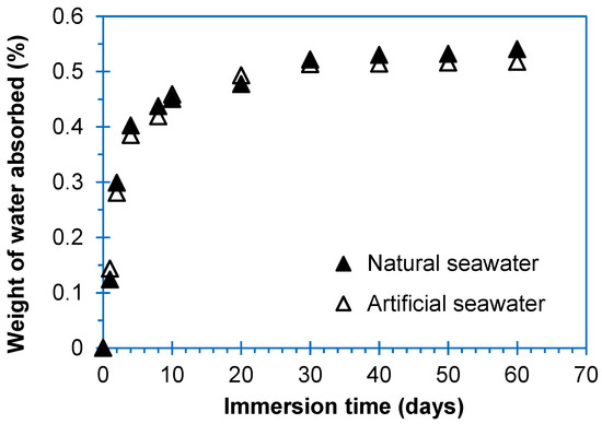 - Water absorption occurred slowly, and the weight remained almost constant after 30 days of immersion, which suggests that saturation had been reached, either for natural or artificial seawater.