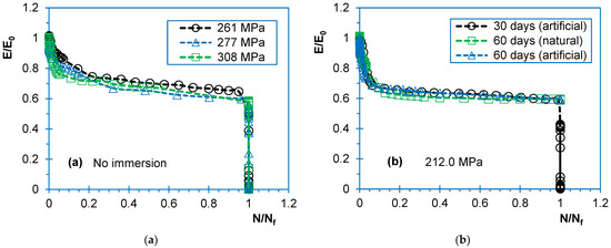 E/E0 versus N/Nf for tests: (a) with different stress amplitudes using samples not immersed and (b) with different immersion times and types of seawater (natural and artificial seawater).