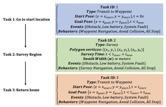 where m, n, and i are mission number, task number, and scenario number, respectively. Figure 1 gives an overview of an example Autonomous Surface Vehicle (ASV) seafloor mapping mission with the proposed architecture.