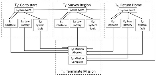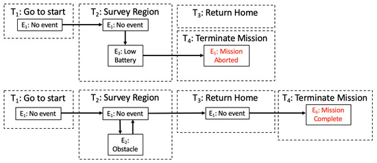 Figure 2 shows an example of this graph structure with the same mission as defined in Figure 1. In Figure 2, insight on relationships between tasks and possible events causing transitions between tasks is observed. Here, the vertices correspond to the possible events and the edges are the possible transitions between events. Behaviors, B, represent the underlying status of the vehicle in response to events and are not shown explicitly in Figure 2 and Equation (3). Figure 3 shows a task and event path for an instance of mission failure versus mission success.