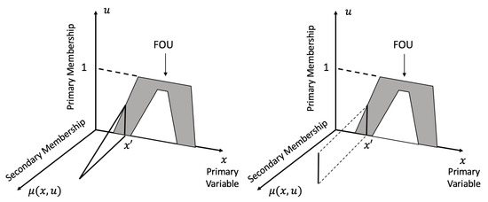 What differentiates IT2-FL from GT2-FL is that the IT2-FL uses a uniform secondary MF (i.e., = 1), whereas the MF of GT2-FL varies with its secondary membership. As such, the resulting IT2-FL reduces the GT2-FL of Equations (5) to (6) as exemplified in Figure 4, and reduces to: