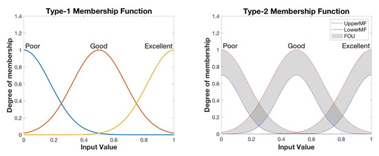 As variance quantifies the uncertainty about a variable’s mean in probability theory, the use of IT2-FL enables the quantification of existing uncertainties within a membership function. The FOU is defined as the area bounded by the Lower Membership Function (LMF) and the Upper Membership Function (UMF) and is depicted in the example MF in Figure 5, where the IT2-FL MF is also differentiated from that of a T1-FL. The IT2-FL FOU may be expressed as the union of all primary memberships such that