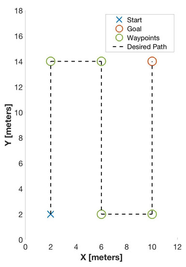 Each grid location is attracted to the next closest waypoint. is the force produced from the A* layer, is a gain term, is the distance between the current grid location and the next closest waypoint, and is a unit vector pointing in the direction of the next closest waypoint. The PFM and A* layers are then added together and the PFM layer is updated as needed for new obstacles. Expanded details are found in [36]. The specific gain values used in for the simulation in this paper are given in Table A1.
