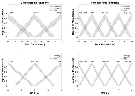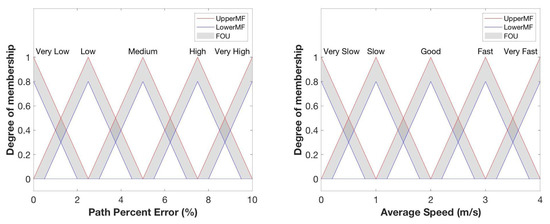Here, since the third dimensional value of the IT2-FL membership is constant, it can be more conveniently represented as a reduced two-dimensional Field of Uncertainty (FOU). For added accuracy and versatility in dealing with MF uncertainties (e.g., vehicle platform uncertainties and sensor noise), the authors choose to implement T2-FL (over T1-FL), and they choose IT2-FL (over GT2-FL) in anticipation of possible data overload burden to maintain computational feasibility, as the GT2-FL approach has been previously shown to introduce design issues and results in high computational costs [31].