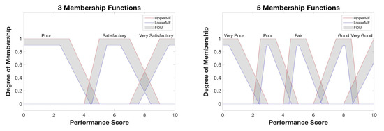 A T2-FL set is denoted as . As opposed to T1 systems, additional lower (LMF) and upper (UMF) membership functions must also be defined for T2-FL. The corresponding MFs denoted as and for lower and upper bounds, respectively. X now refers to the primary domain, and is now defined as the secondary domain. Rewriting Equation (4) as a General T2 system, can be defined as (as shown in [29,33]):