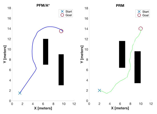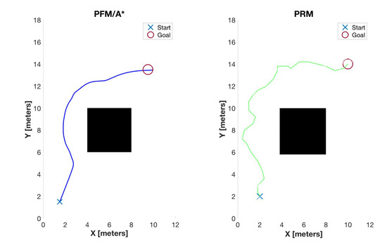For demonstration purposes (and without loss of generality), PERFORM incorporates two different autonomous path planning techniques for evaluation and direct comparison: (1) a multilayered Potential Field Method/A-Star (PFM/A*) approach [36] and (2) a Probabilistic Roadmap (PRM) method [37]. Details on both algorithms may be found in Appendix A. Both the PFM/A* and PRM techniques are evaluated and compared in the case of three separate mission scenarios:
