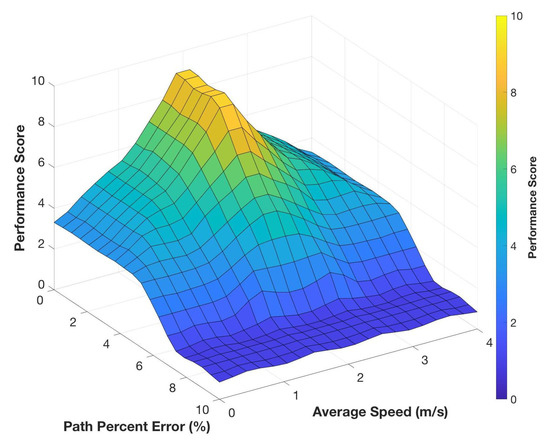 The rule base for Case III is constructed to reflect a narrower region for acceptable performance and shown in Table 4. To receive a higher performance score, the vehicle’s average speed should remain in the “good” range window while maintaining low error over the path taken.