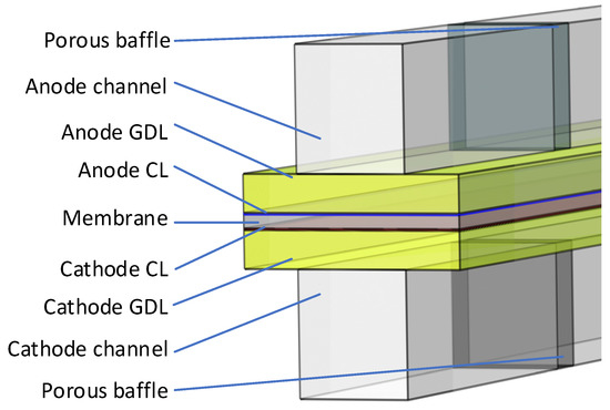 The geometry of the PEMFCs with the porous baffle is shown in Figure 2 and the geometric parameters and operating parameters are shown in Table 1. The baffle was made of a porous material with a thickness equal to the cross-section of the flow channel, completely blocking the whole flow channel, and the gas in the flow channel can only complete material transport through the pores of the baffles and GDL.