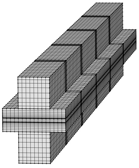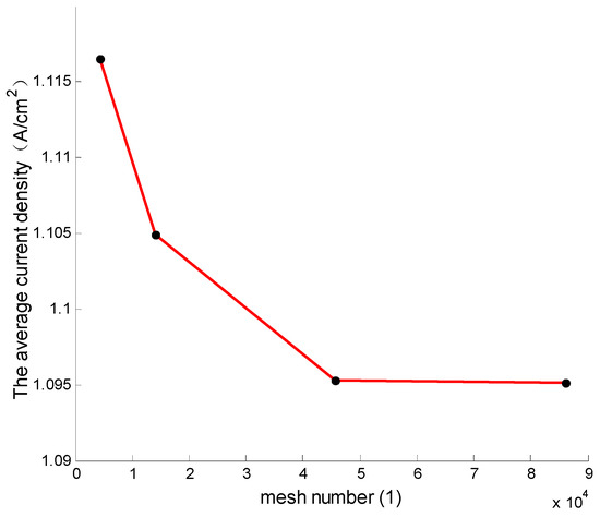 The mathematical model is established using the multi-physical field simulation software COMSOL 5.5, and the aforementioned coupled equations were iteratively solved by the finite volume method. To test grid independence, the model was divided into four different grids (4368, 14,112, 45,696, and 86,016). As shown in Figure 3, when the voltage is 0.4 V, the difference between the current density calculation results for the 45,696 and 86,016 grid cells is less than 0.1%, which has little impact on the results. The calculation model of the porous baffle PEMFC is shown in Figure 4. In order to ensure the accuracy of the calculations, the mesh density is also different due to the different thicknesses of each component. The model takes 30 min for the calculations on the 2.4 GHz workstation with 64 RAM.
