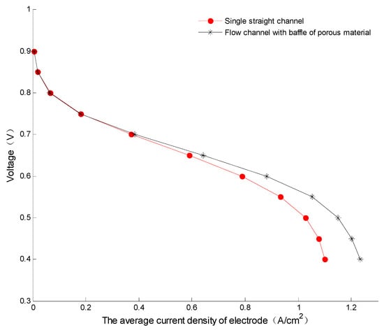 The comparison of the polarization curves between the PEMFC with a straight channel and the PEMFC with a straight channel and four porous baffles.