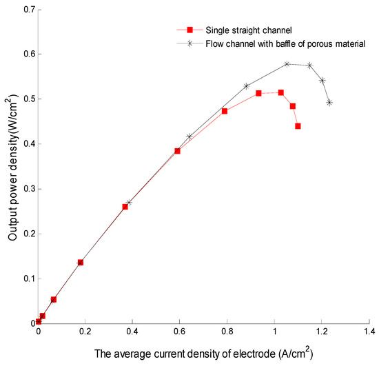 The comparison of power density curves between the PEMFC with a straight channel and the PEMFC with a channel with four porous baffles is shown in Figure 7. With the increase in the current density, the influence of the flow channel with the porous baffle on the performance of the PEMFC gradually increases and the maximum power density of the PEMFC with the four porous baffles increases from 0.5139 (W/cm2) to 0.5789 (W/cm2), i.e., an increase of 12.7%.