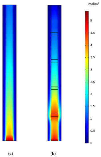 Two-dimensional cloud diagram: oxygen concentration distribution of (a) the GDL cathode in a straight channel model and (b) the GDL cathode in a straight channel model with four porous baffles at 0.4 V.