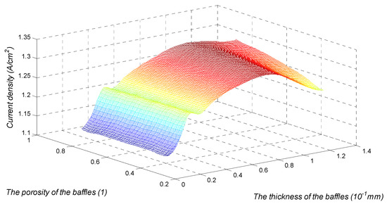 Figure 9 shows the variation of the average current density with the thickness and baffle porosity of the PEMFCs with four baffles at 0.4 V. The influence of the baffle porosity on the average current density of the PEMFC varies in function of thickness. When the thickness of the baffle is 1.28 mm, and the porosity of the baffle increases from 0.3 to 0.8, the average current density of the PEMFC increases from 1.238 A/cm2 to 1.298 A/cm2, i.e., an increase of 7.428%. When the porosity of the baffle is constant, the influence of the baffle thickness on the performance of the PEMFC increases and decreases twice, forming two peaks and valleys. At a voltage of 0.4 V and baffle porosity of 0.5, the first peak of the average current density is at 1.239 A/cm2, at a thickness of 0.2497 mm, whilst the second peak is at 1.308 A/cm2, at a thickness of 0.8 mm. The valley is at 1.232 A/cm2 and at a thickness of 0.3224 mm.
