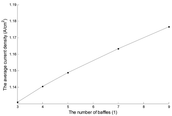 Figure 10 shows the effect of the number of baffles on the performance of the PEMFC for a porosity of 0.3, with a baffle thickness of 0.8 mm, and a voltage of 0.4 V. Figure 10 shows that the performance of the PEMFC increased approximately linearly with the increase in the number of baffles. When the number of baffles increased from 3 to 9, the average current density of PEMFCs increased from 1.1301 A/cm2 to 1.1766 A/cm2, i.e., an increase of 4.11%.