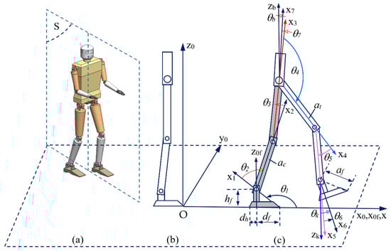 A human-like bipedal robot can have main parts that include a head, body, two arms, and two legs as shown in Figure 1a. Arms and legs are made up of several links, connected by joints, and a joint can have from 1 up to 3 degrees of freedom of motion. The head, arms, and legs are connected to the robot body by joints from 1 to 3 degrees of freedom. With such a structure, the robot can perform movements as well as manipulations ranging from simple to complex spatial actions. The goal of the paper was to present the robot’s walking control and not to mention the dynamic effects of arm movement. Therefore, mechanically, the head and arms were integrated with the robot body as a solid object and are collectively referred to as the robot body when surveying and calculating from now on. The robot can move on flat horizontal ground, or on ground that is sloping and rough, convex, and complex. A simple motion of the robot is a straight, horizontal motion. This motion is called a motion that is in the sagittal plane []. Figure 1a–c shows the robot moving in the sagittal S plane. With this motion, the survey model of the robot can lead to a simple model in which the parts of the legs that are connected to each other and to the robot body are revolute joints. Revolute joints that connect the robot body to the thighs of the legs are called hip joints. The knee joints connect the thighs to the calves, the ankle joints connect the calves to the feet. All revolute joints have a rotation axis perpendicular to the sagittal plane. With such structure and motion in the sagittal plane, the survey model of the robot is returned to the flat model, as shown in Figure 1b,c. Figure 1b represents when the robot is stationary in the vertical state, Figure 1c demonstrates the robot in walking position. Because the paper focuses on studying control algorithms based on fuzzy logic and building a fuzzy rule system, this flat model was used.