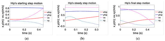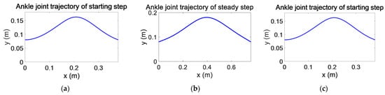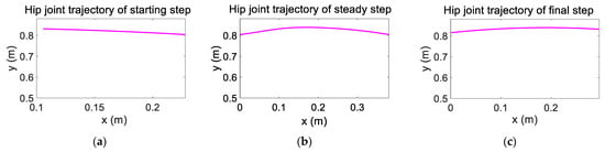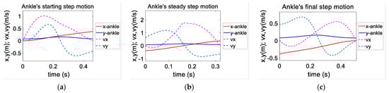 Figure 3a–c shows the motion trajectory of the hip joint in the starting, steady, and final steps, respectively. Similarly, the movement of the ankle joint is shown in Figure 4a–c.