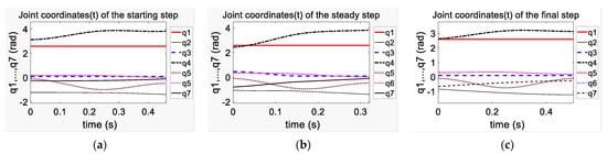 The motion of robot link: the joint coordinates (t) in the starting (a), steady (b), and final (c) steps.