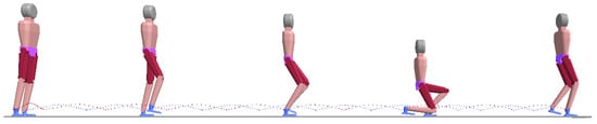 Another parameter to be considered is the position of the center of mass of the whole bipedal robot system. Intuitive and preliminary calculations show that the lower the center of mass position, the closer the ZMP point is to the support polygon domain or the closer that it is to being within the support polygon domain. However, the position of the center of mass is always changing in the moving process, and the calculation is quite complicated, so here another parameter was chosen, which was the θ3 joint coordinate of the supporting leg. Because if θ3 was large, then the center of mass would be low and vice versa. Figure 10 shows some robot gaits with different levels of lowering of the center of mass. The relative horizontal position of the center of mass relative to the position of the supporting foot also affects the robot’s ability to resist tipping.