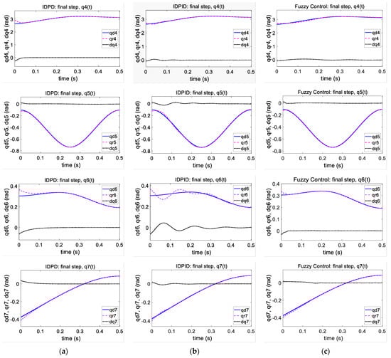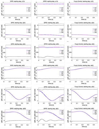 The simulation results of the fuzzy controller for the starting step, steady step, and final step are shown in Figure 15c, Figure 16c and Figure 17c, respectively, in which the motion of each joint i (i = 1, …, 7) changes with time and is represented, respectively, in each graph, including the designed desired trajectory mentioned in Section 2 (qd1, …, qd7), the received trajectory (real trajectory) from the control result (qr1, …, qr7), and the errors (dq1, …, dq7) between the desired trajectory and the real trajectory.