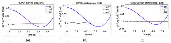 The simulation results of the IDPID controller for the starting step, steady step, and final step are shown in Figure 15b, Figure 16b and Figure 17b, respectively, in which the motion of each joint i (i = 1, …, 7) changes with time and is represented, respectively, in each graph, including the designed desired trajectory mentioned in Section 2 (qd1, …, qd7), the received trajectory (real trajectory) from the control result (qr1, …, qr7), and the errors (dq1, …, dq7) between the desired trajectory and the real trajectory.