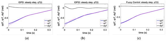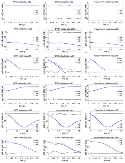 The simulation results of the IDPD controller for the starting step, steady step, and final step are shown in Figure 15a, Figure 16a and Figure 17a, respectively, in which the motion of each joint i (i = 1, …, 7) changes with time and is represented, respectively, in each graph, including the designed desired trajectory mentioned in Section 2 (qd1, …, qd7), the received trajectory (real trajectory) from the control result (qr1, …, qr7), and the errors (dq1, …, dq7) between the desired trajectory and the real trajectory.