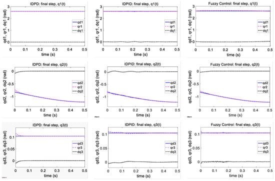 The calculation results obtained the average error between the desired joint coordinate value and the actual coordinates at the step in the steady period, which is also in the range of ~10−3 radians. The steady step simulations were similar to those of the starting step, including three graphs. The graph can be observed to see the accuracy and reliability of the controllers. The fuzzy controller can be as precise as the controller that is based on the exact dynamic model IDPD. The graph observation shows that the IDPID controller based on the dynamic model including noise was slightly less accurate.