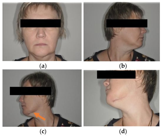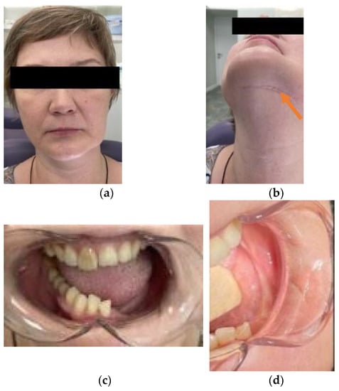 (a–d) Patient A: 47-year-old female. DS: Medication-related osteonecrosis of the jaw (the left side). Surgical treatment: Resection of the lower jaw on the left (9 September 2018).