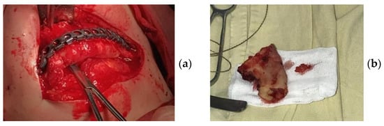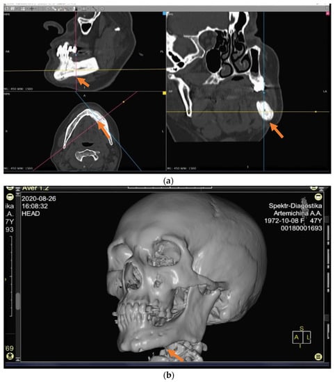 The patients in the main group (43 subjects) underwent segmental resection of the jaw after preoperative preparation (Figure 2 and Figure 3a,b).