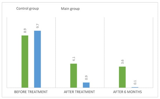 In the patients in the main and control groups, the pain intensity index values before treatment approached similar values. After surgery, the pain intensity index in the main group was close to normal values. In the control group, 30 days after conservative treatment, there was a tendency for the parameter to decrease; however, after six months, it did not reach the “no pain” mark (Figure 8 and Figure 9a,b).
