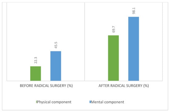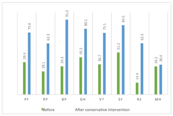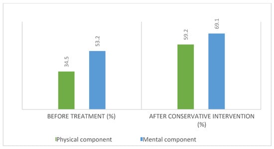 Before conservative treatment, this group of patients had a reduced quality of life, and after conservative intervention, they achieved a score of 53.2%, which corresponds to a “moderate” quality of life (Figure 11). This suggests the existence of a positive trend. In regard to the mental component after conservative treatment, the quality of life increased (69.1).