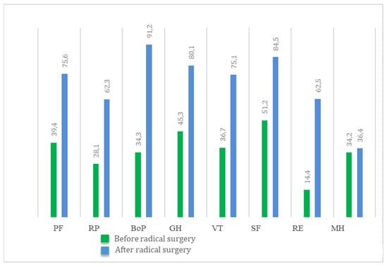 Before radical surgery, the main group of patients also had a high level of bodily pain (95.2), but after surgery this decreased to 12.4. The remaining parameters also showed a significant difference before and after radical surgery, indicating a positive trend (Figure 12).