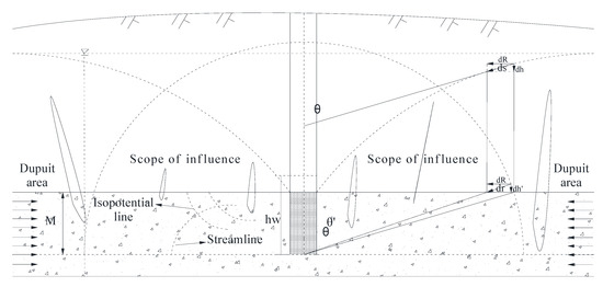 Due to , the aquifer is less affected by pumping when is large, and the flow line is basically horizontal. Meanwhile, is established and is the flow rate per extended meter of well. Therefore,