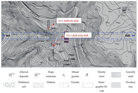 The Gaoligong Mountain is located between Nujiang and Longling stations, with a maximum burial depth of about 1155 m. The tunnel inlet mileage is D1K192 + 302, the exit mileage is D1K226 + 840, the total length of the tunnel is 34,538 m. In order to speed up the construction progress and solve the problems of construction ventilation and operation ventilation, No. 1 shaft is set up in the middle of the cave. No. 1 shaft sub-shaft is located 52 m to the left of D1K205 + 053 line, and the depth of shaft is 764.74, just like Figure 2.