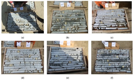 Core images of No. 1 shaft sub shaft. (a) 101.3 to 114.0 m; (b) 269.10 to 280.50 m; (c) 380.60 to 391.70 m; (d) 456.10 to 466.00 m; (e) 601.30 to 611.50 m; (f) 666.80 to 678.70 m.