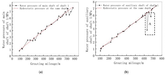 According to the grouting water pressure test of Gaoligong Mountain, the water head of Gaoligong Mountain is very high, as shown in Figure 4. In Figure 4b, the steep crack at 630 m is developed, and the grouting effect is poor. Therefore, several times of grouting have been carried out, which leads to the water pressure obtained at this time belongs to the water pressure after grouting. In addition, this is the reason why water pressure dropped fast at A. The water heads at different depths are basically equal to, regardless of the main shaft or auxiliary shaft.