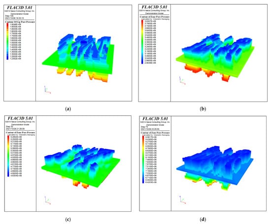 Hydraulic pressure field of different excavation sections with grouting. (a) Aq1, (b) Aq2, (c) Aq3, (d) Aq4.