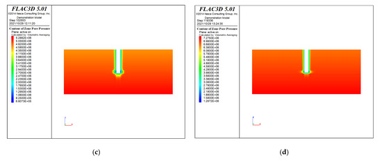The site shaft excavation is 3.6 m per section, while this paper takes the simulation of four confined aquifer excavation to the bottom. No grouting excavation and grouting excavation under the four processes at the seepage field changes are shown in Figure 7 and Figure 8. Meanwhile, taking the FISH language programming to derive the shaft the water inflow.