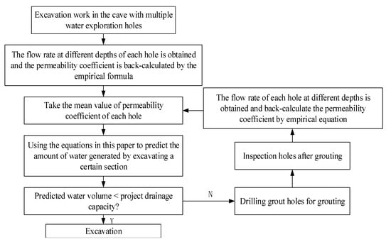 With the development of calculation technology, various numerical simulation software have high accuracy in water inflow prediction. Among the available studies, COMSOL Multiphysics [,], FLAC3D [,,,] and MODFLOW [,,] and other software verified to be better able to simulate the engineering water surges in excavations under complex geological conditions. Therefore, the analysis of the water surge in recent years has focused on numerical means of research, and less research on theoretical aspects. Although the numerical simulation method can take into account the actual situation of the project, including geology, excavation profile, flow-solid coupling, etc., to some extent, it has its own limitations. As stated by Hwang and Lu [] numerical model are tedious, time-consuming, and expensive for tunnel engineers in practice. For example, their assumptions are mostly small deformations and have great reliance on the ground investigation data. Due to the accuracy and difficulty of actual exploration, it makes the model parameters have certain errors, which may produce simulation results that are not in line with reality in some projects.